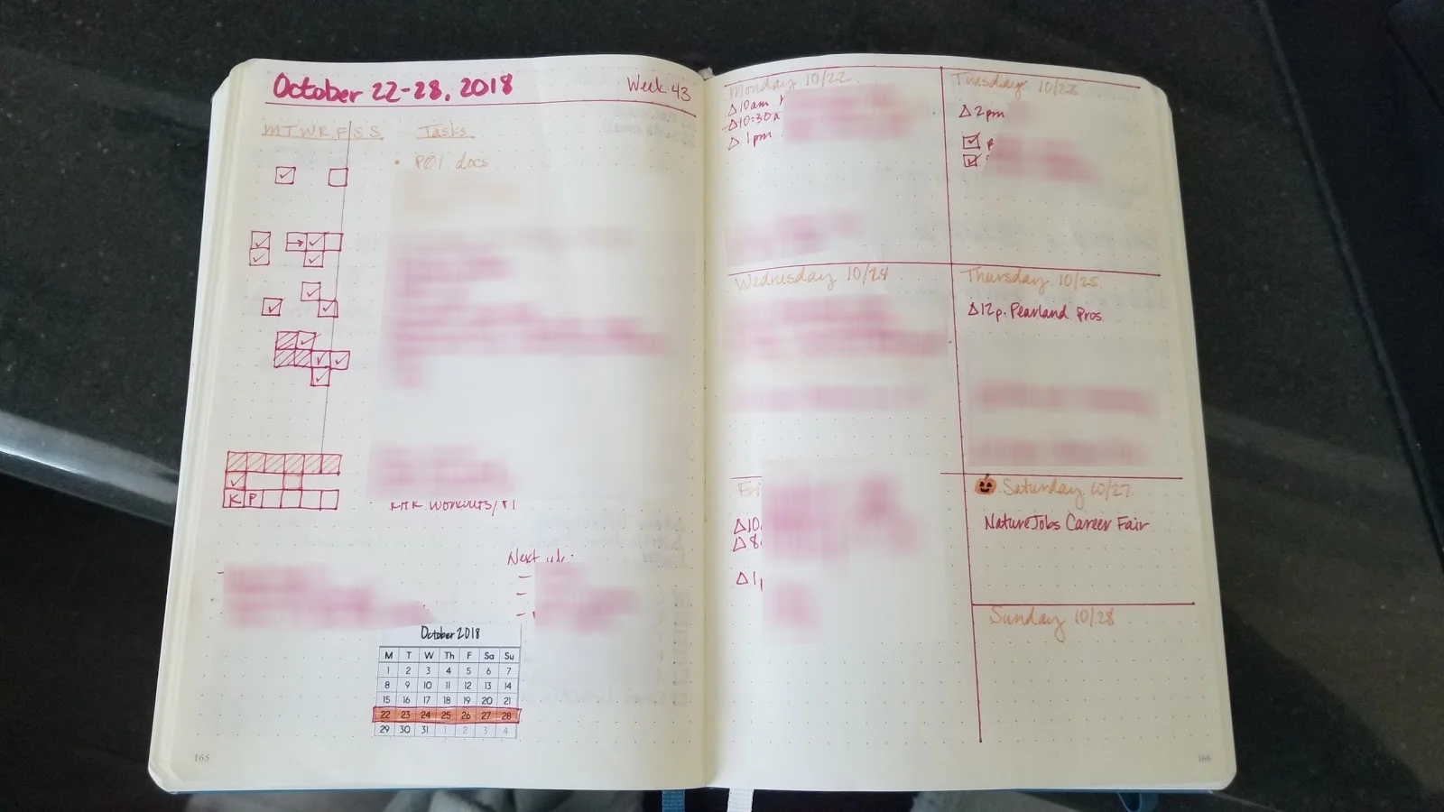The major reason my Bullet Journal works for me is that I keep everything together in one place: my to do lists, my meeting schedule, plus notes for personal and professional happenings. The pages are numbered and I keep track of what’s where by filling in the index as I go through the year. Because the pages aren’t pre-filled out, my meeting notes are adjacent to the current weekly planning layout.