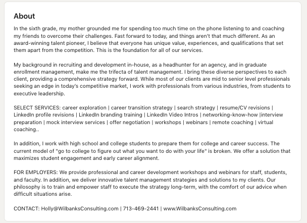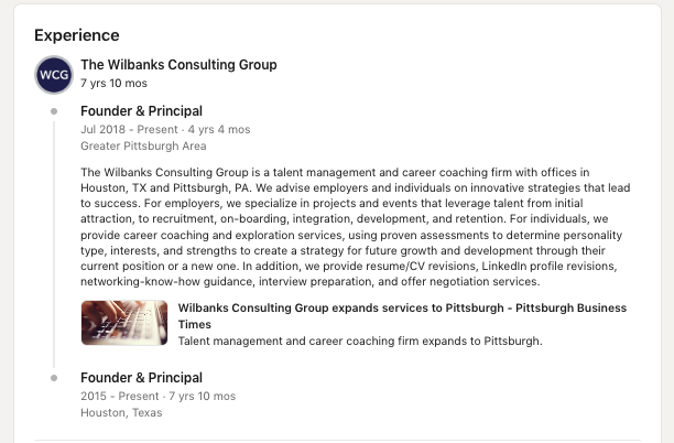 Spending the appropriate time to make your LinkedIn Profile “pop” may be key in getting a job using LinkedIn. If you are struggling to know exactly how to showcase your value on your LinkedIn profile, let us partner with you to help you shine! The team at Wilbanks Consulting Group is happy to help! Reach out to one of our qualified coaches today for a free, 30-minute consultation.