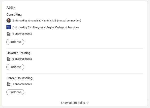 Many recruiters will search for certain keywords and skills when utilizing LinkedIn to find candidates. Make sure that your profile shows all applicable skills for your profession (you can list up to 50; make sure to utilize this feature!). Also, while it’s possible to list every software program for which you are knowledgeable, it would be better to simply list “Microsoft Office” (as opposed to Word, Excel, PowerPoint, etc.) so that you can save your allotment of skills for those related to your function or trade.